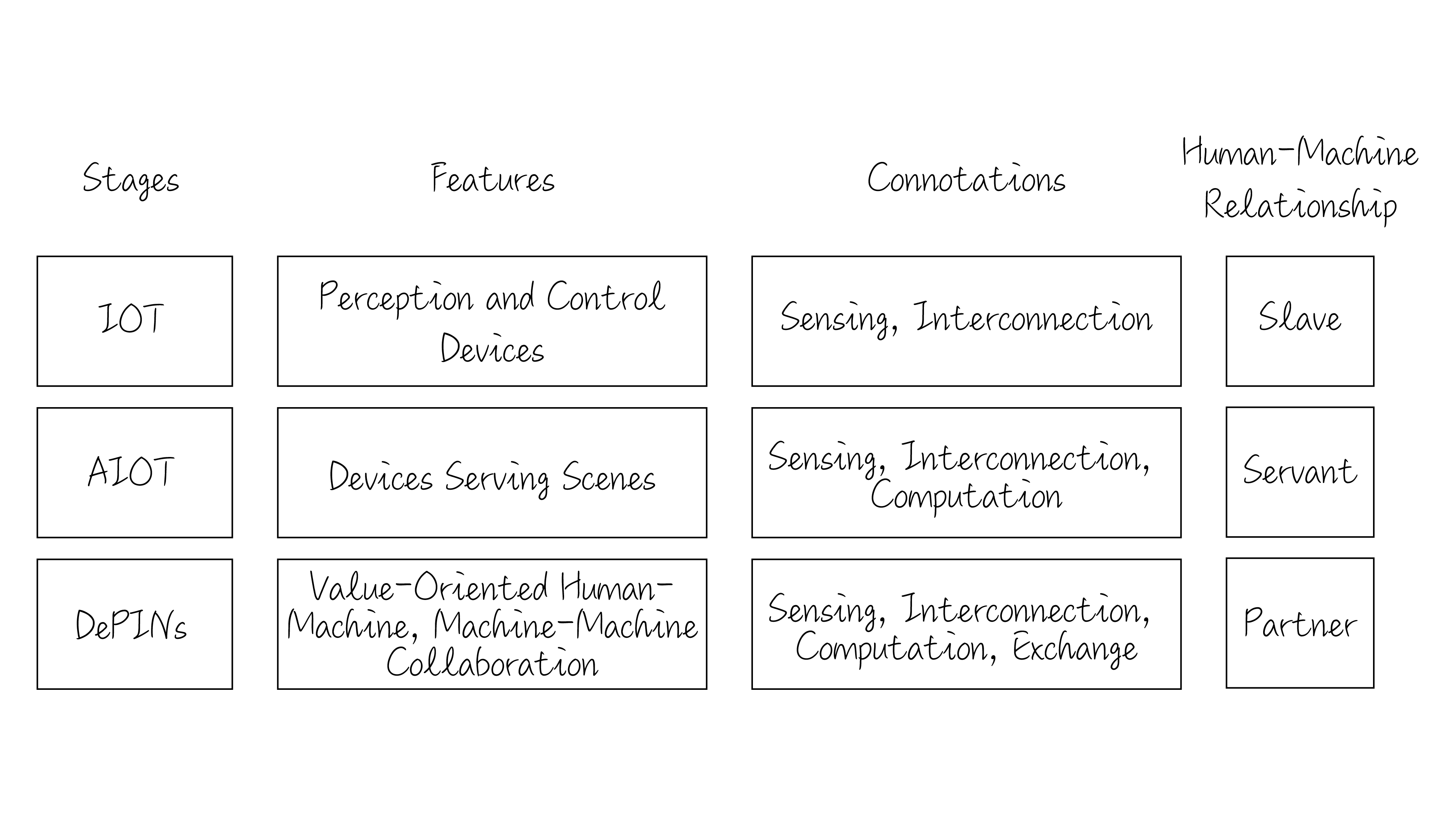 DePIN can be considered the next stage in the development of AIoT (Artificial Intelligence of Things), where Artificial General Intelligence (AGI) will endow devices with intelligence and consciousness. At the same time, Web3 technology provides a decentralized system of credit and value, offering key elements such as incentive mechanisms, rights management, and supply-demand matching for building IoT networks from the bottom up. Under this architecture, IoT devices are mapped to on-chain assets, with devices being assigned immutable digital identities (DID) and value storage (Wallet).